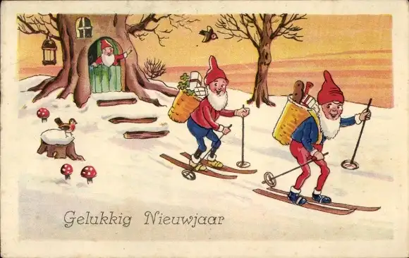Künstler Ak Neujahr, Zwerge, Fliegenpilze