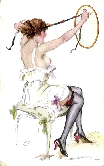 Künstler Ak Ney, Junge Frau in erotischer Kleidung, barbusig, Spiegel