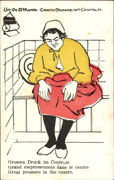 Künstler Ak Niederlande, Frau geht auf die Toilette, Uit de IIe Kamer, Groote Drukking in 't Centrum