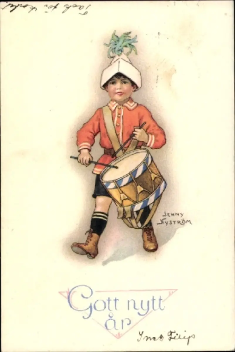 Künstler Ak Nyström, Jenny, Glückwunsch Neujahr, Junge mit Trommel