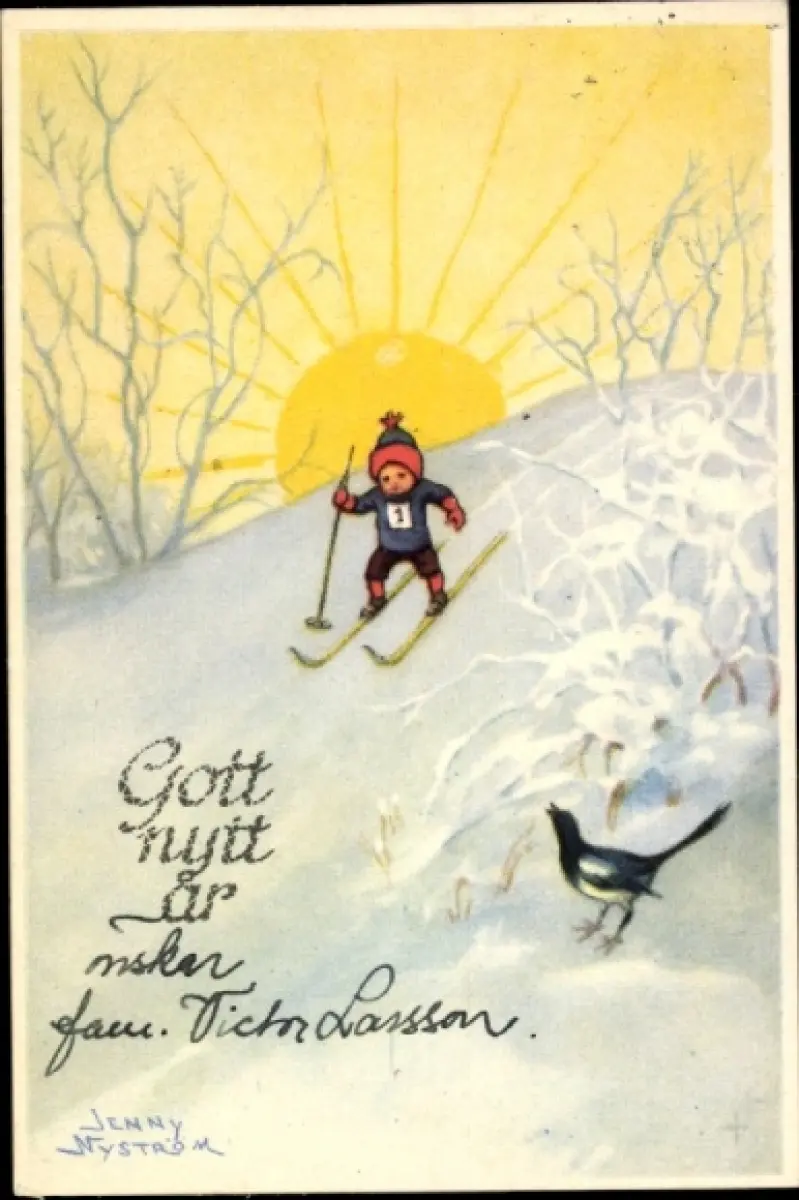 Künstler Ak Nyström, Jenny, Glückwunsch Neujahr, Kind auf Skiern
