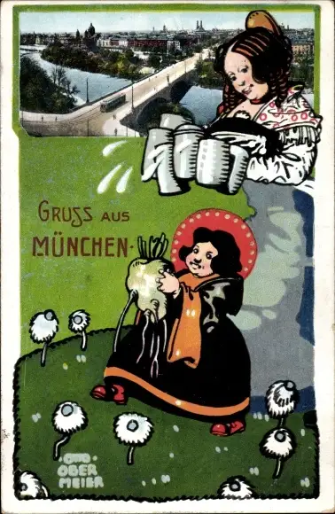 Künstler Ak Obermeier, Otto, München, Stadtansicht, Kellnerin mit Bierkrügen, Münchner Kindl