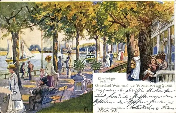 Künstler Ak Ostseebad Warnemünde Rostock, Promenade am Strom