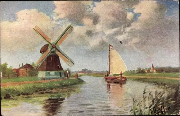 Künstler Ak Oudes, J., Niederländische Windmühle, Fluss, Segelboot