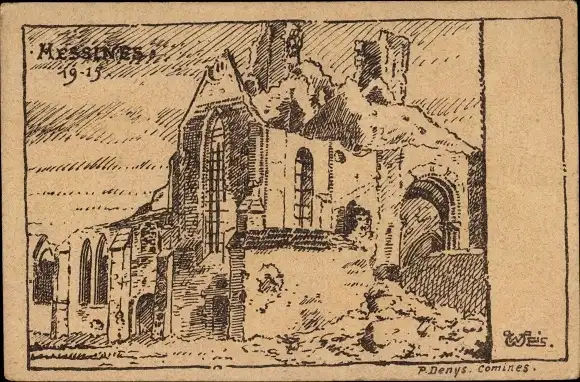 Künstler Ak P. Denys, Messines Mesen Westflandern, Kriegszerstörung 1. WK