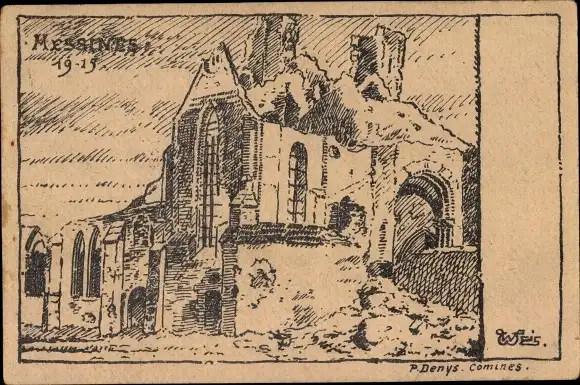 Künstler Ak P. Denys, Messines Mesen Westflandern, Kriegszerstörung 1. WK