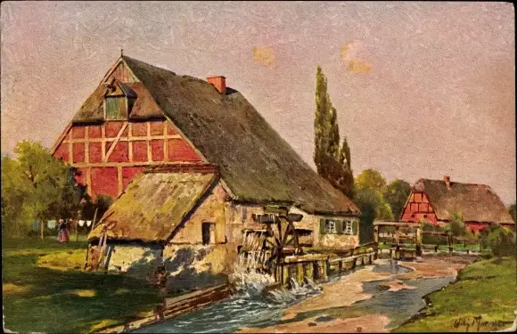 Künstler Ak Partie an einer Wassermühle