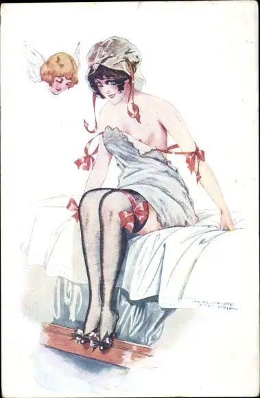 Künstler Ak Pepin, Maurice, Frau im Unterkleid mit Strümpfen, Busen