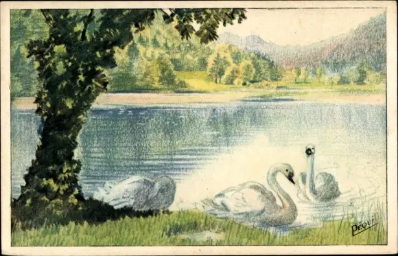 Künstler Ak Pequi, Drei Schwäne am Wasser
