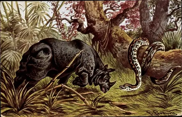 Künstler Ak Perlberg, F., Nashorn greift eine Schlange an