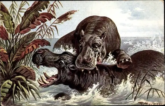 Künstler Ak Perlberg, F., Zwei kämpfende Nilpferde