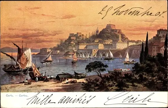 Künstler Ak Perlberg, Friedrich, Korfu Griechenland, Teilansicht vom Ort, Küstenpartie, Segelboote