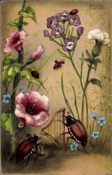 Künstler Ak Petersen, H., Musizierende Maikäfer, Marienkäfer, Blumen