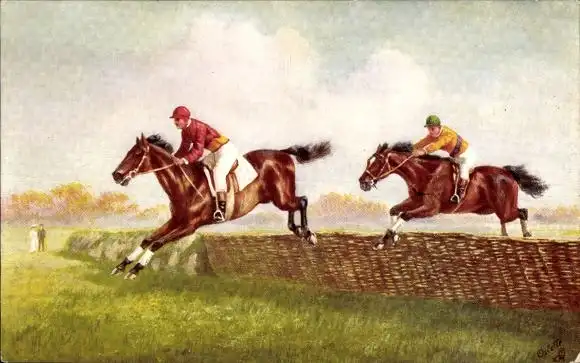 Künstler Ak Pferderennen, Sprung über ein Hindernis