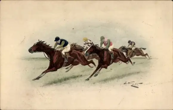Künstler Ak Pferderennsport, Reiter, Jockeys, Pferde