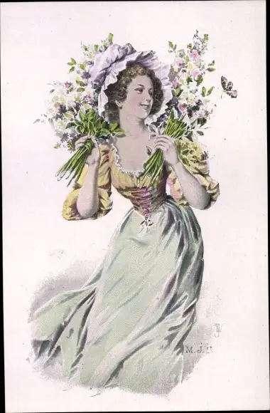 Künstler Ak Portrait einer Frau, Blumen, Schmetterling