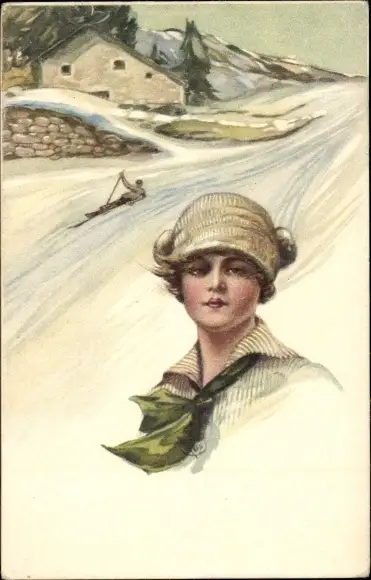 Künstler Ak Portrait einer jungen Frau, beim Skifahren, Sturz