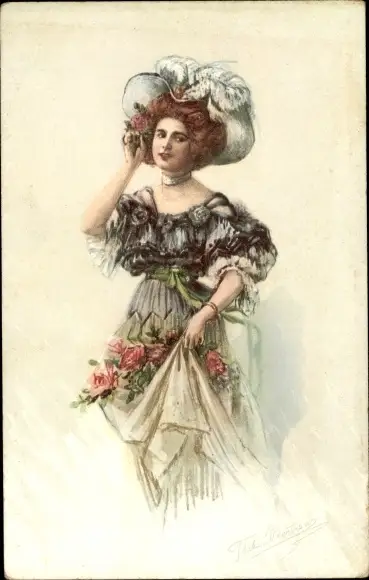 Künstler Ak Portrait einer rothaarigen Frau mit Hut
