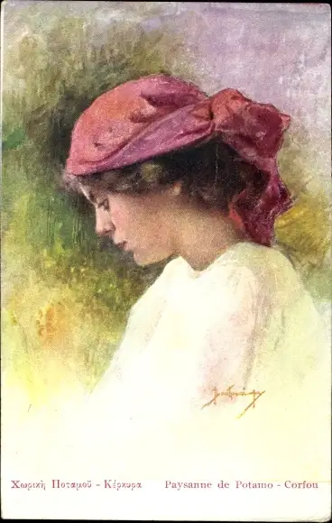 Künstler Ak Potamo Korfu Griechenland, Portrait einer Frau, Kopftuch
