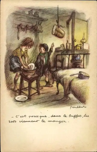Künstler Ak Poulbot, Mädchen spült Geschirr, aufgehängtes Brot