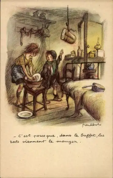 Künstler Ak Poulbot, Mädchen spült Geschirr, aufgehängtes Brot