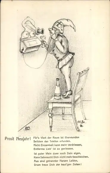 Künstler Ak Prosit Neujahr, Zwerg am Telefonhörer, Sektflasche, Stuhl