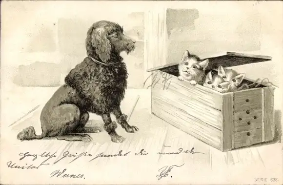 Künstler Ak Pudel, junge Katzen in einer Holzkiste