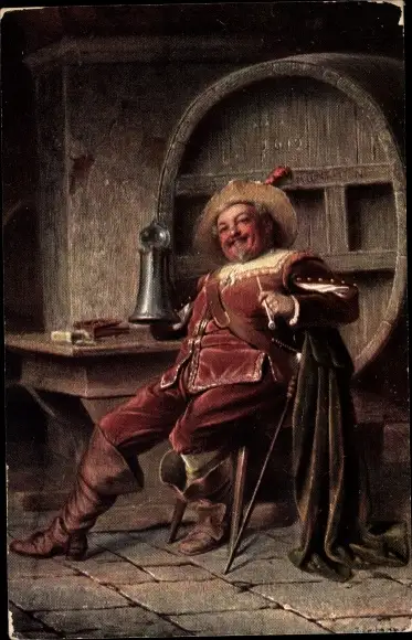 Künstler Ak Rauchender Mann im Weinkeller, Weinfass