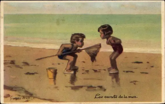 Künstler Ak Redon, Les secrets de la Mer, Kinder am Strand, Fischernetz