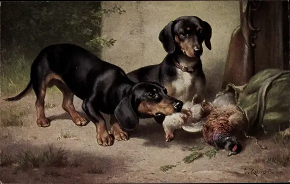 Künstler Ak Reichert, Zwei Dackel mit erlegten Vögeln