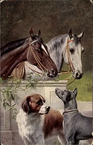 Künstler Ak Reichert, Zwei Pferde und Hunde, Bernhardiner