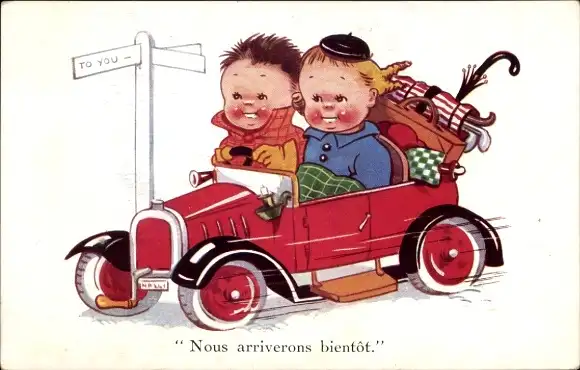 Künstler Ak Reisende in einem Automobil, Golfschläger