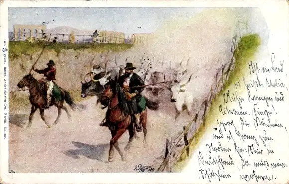 Künstler Ak Reiter mit Rinderherde, Hirten