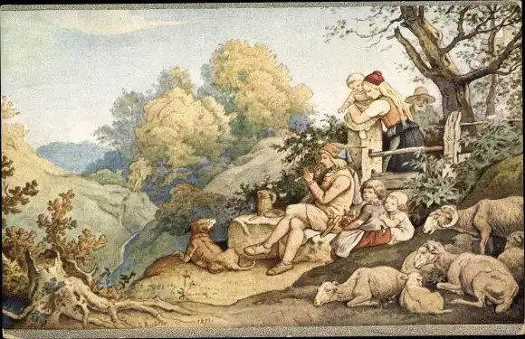 Künstler Ak Richter, Ludwig, Frühling, Schäfer spielt Flöte