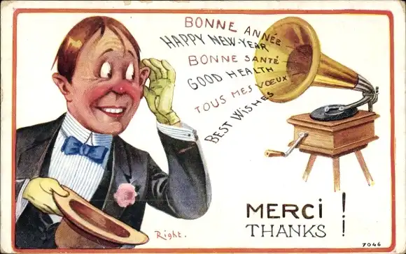 Künstler Ak Right, Neujahr, Mann im Frack, Grammophon