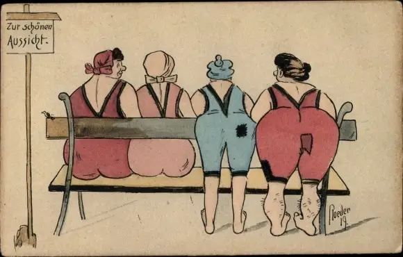 Künstler Ak Roeder, Frauen an der Sitzbank, Zur schönen Aussicht, Po, Bademode