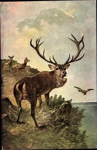 Künstler Ak Röhrender Hirsch, Geweih, Vogel im Flug
