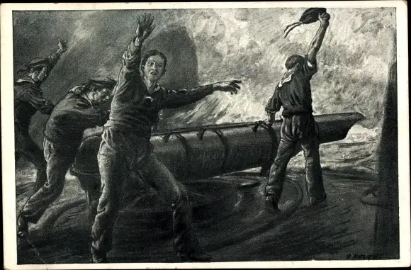 Künstler Ak Roloff, O., Ein Volltreffer, Matrosen am Torpedogeschütz