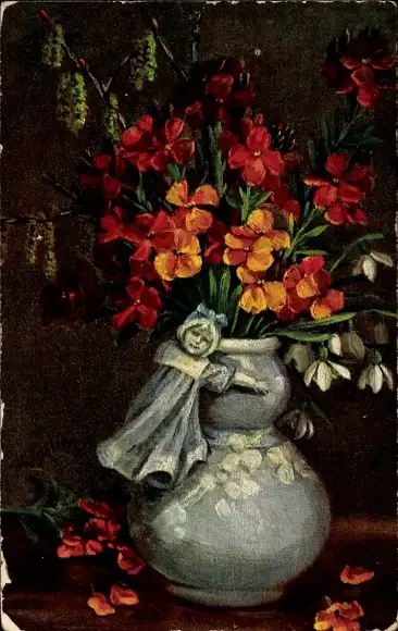 Künstler Ak Rote und orangenfarbene Blumen in der Blumenvase