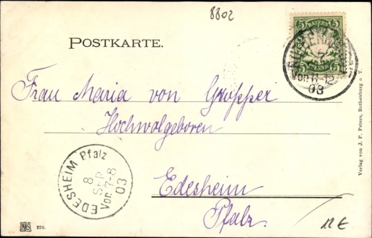 gelaufen 1903, leicht fleckig, Leim an den Ecken gelöst, sonst guter Zustand