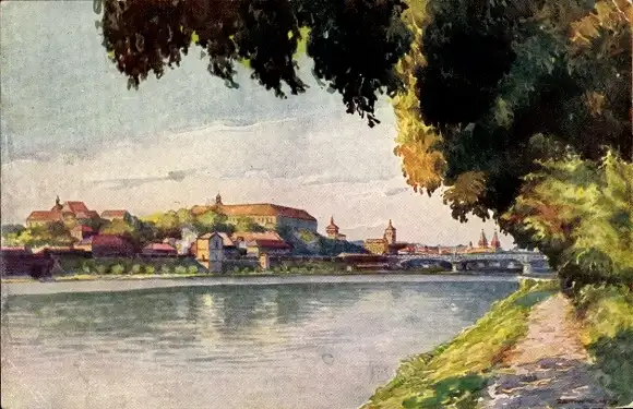 Künstler Ak Roudnice nad Labem Raudnitz an der Elbe Reg. Aussig, Blick zur Stadt vom Ufer aus