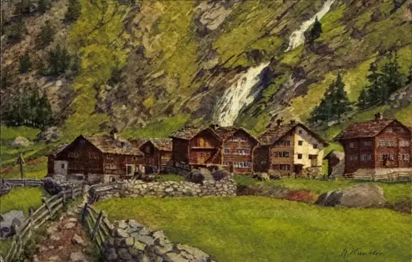 Künstler Ak Saas Almagell Kanton Wallis, Ortspartie, Wasserfall