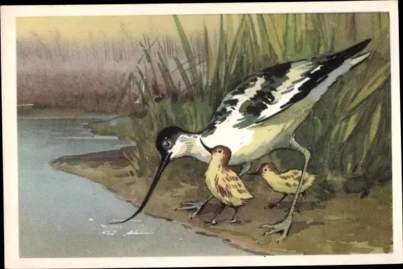 Künstler Ak Säbelschnäbler mit Jungtieren am Wasser