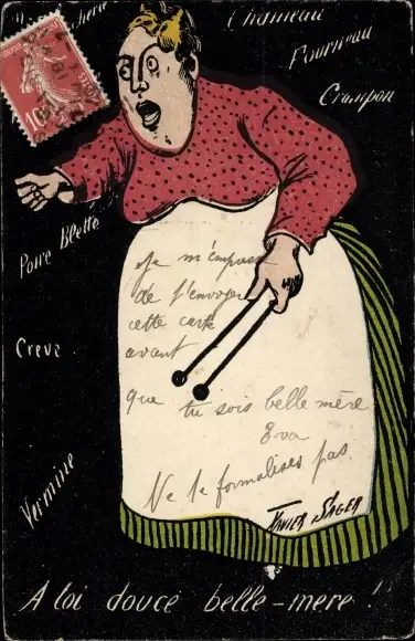 Künstler Ak Sager, Xavier, Couce belle mere, Schwiegermutter mit Stricknadeln