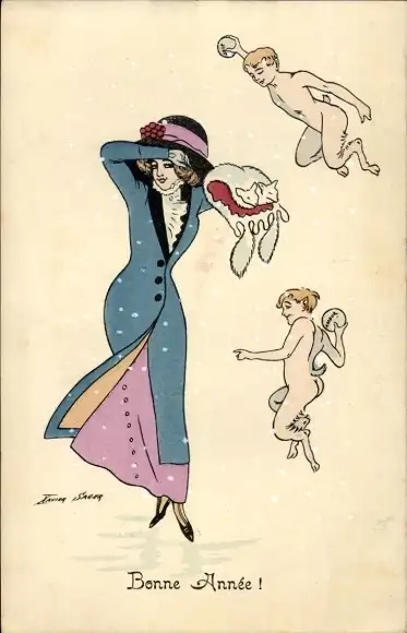 Künstler Ak Sager, Xavier, Glückwunsch Neujahr, Engel, Frau in blauem Mantel