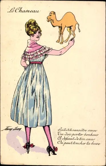Künstler Ak Sager, Xavier, Le Chameau, Frau und Kamel