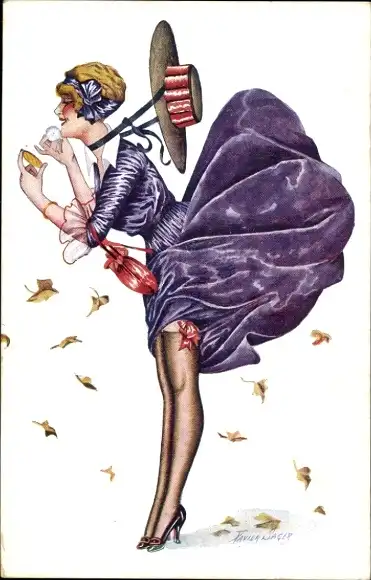 Künstler Ak Sager, Xavier, Wind weht Rock einer Frau hoch, Strümpfe, Puderdose, Hut