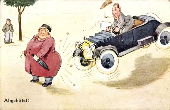 Künstler Ak Scheuermann, Willi, Abgeblitzt, Auto prallt vom Hintern einer dicken Frau ab
