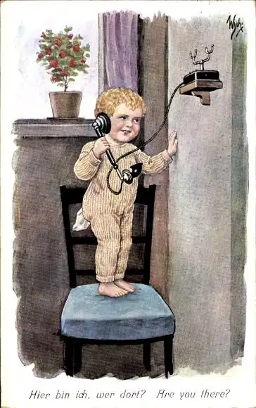 Künstler Ak Scheuermann, Willi, Hier bin ich, wer dort?, Kind im Schlafanzug, Telefon