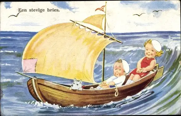 Künstler Ak Scheuermann, Willi, Kinder im Segelboot bei Sturm